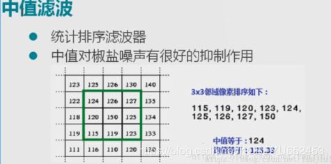 使用像素点邻域附近的像素的中值代替该点的像素值。通俗点来说,在这个像素的左边找五个像素点,右边找五个像素点,将这些像素进行排序,排序过后产生一个中值,用中间大小的值,来代替该像素的值。