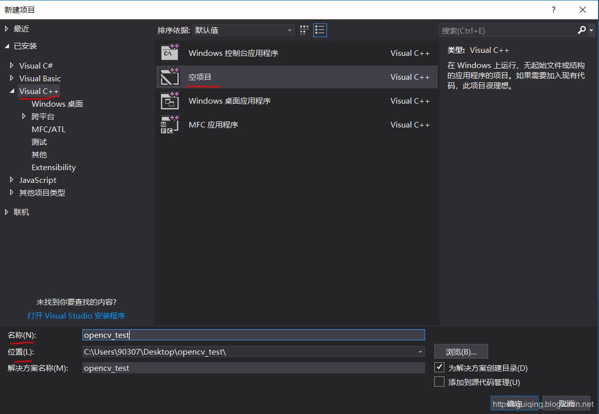 点击之后,如图5所示,在【Visual C++】栏中选择【空项目】,然后给项目命名,例如名称为opencv_test,设置好项目位置,然后点击确定。