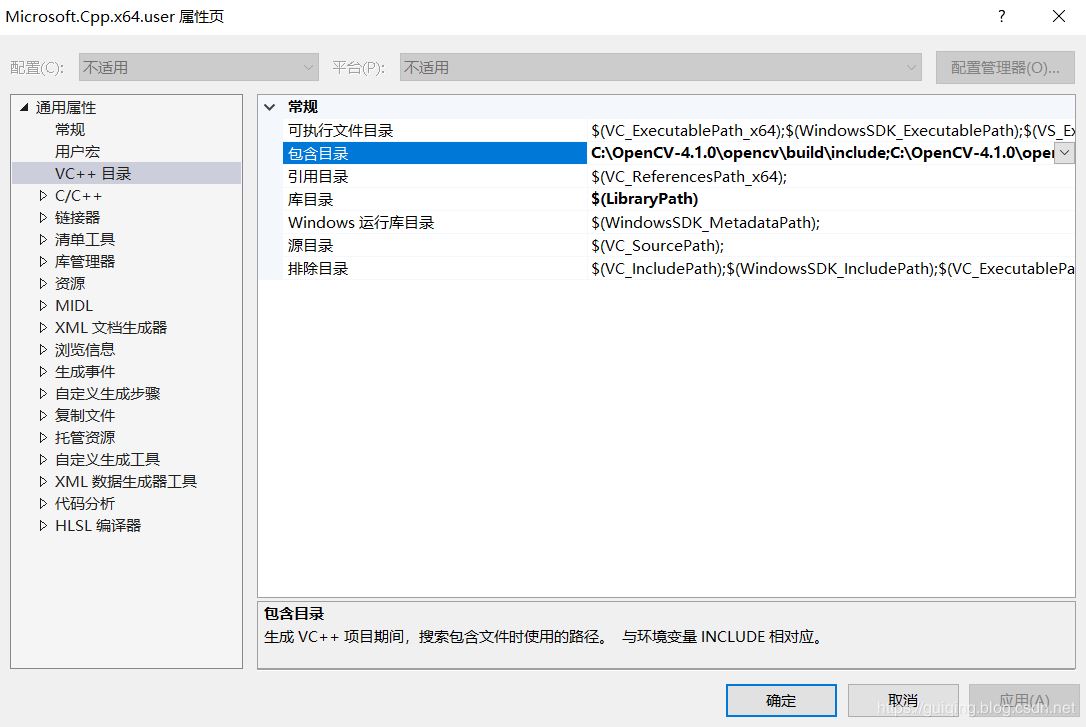 将以下两条路径名添加到【包含目录】中。注意:具体路径名根据自己OpenCV路径不同而不同。