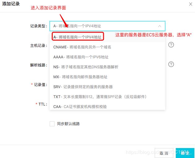 1、记录类型。需要注意的是解析内容的记录类型只有两种,如果是云服务器或者VPS就选择A,虚拟主机就选择CNAME。