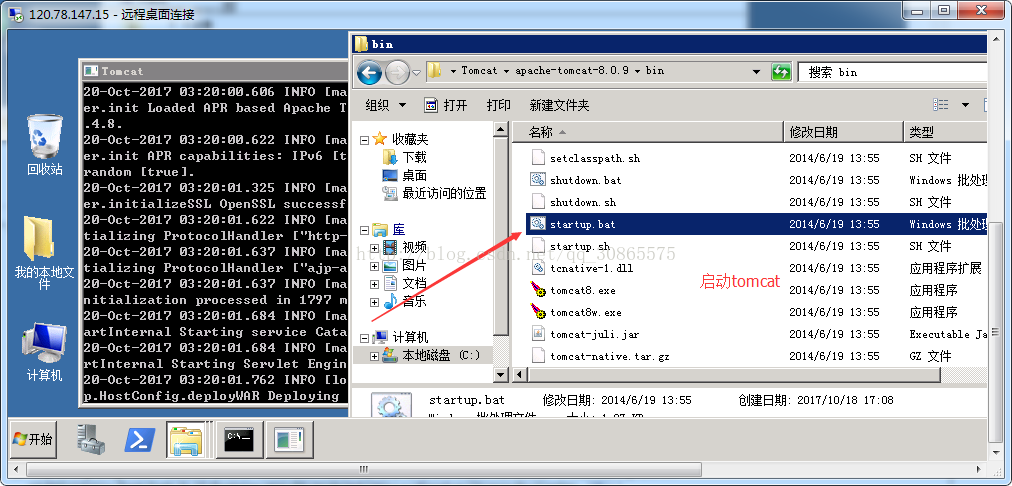 5. 配置好之后。把本地的项目的war包复制到 服务器下的Tomcat 目录的webapps上。 之后启动Tomcat。如图所示。