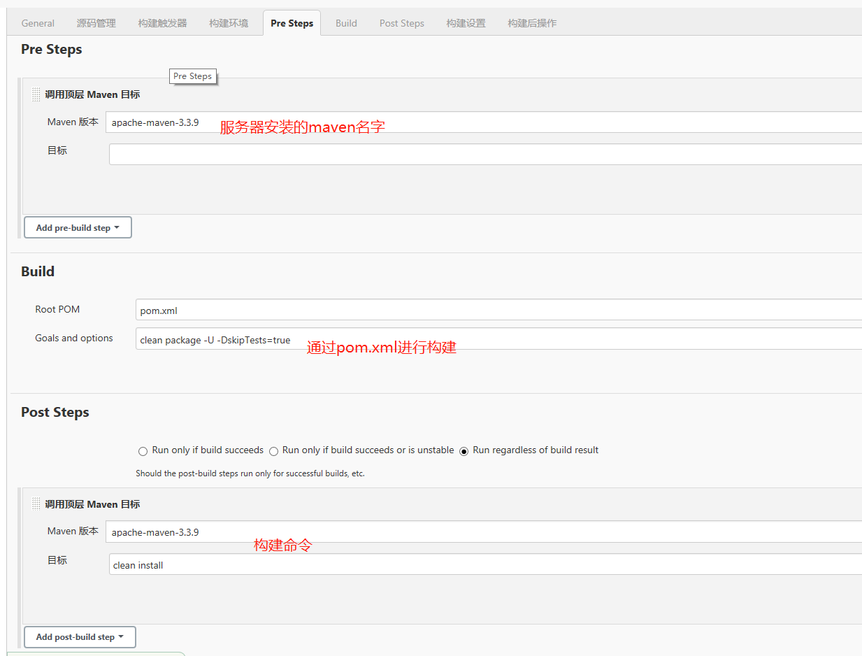 构建:Post Steps选择Send files or execute commands over SSH,下面的构建后操作 -> Deploy war/ear to a container 就不需要了: