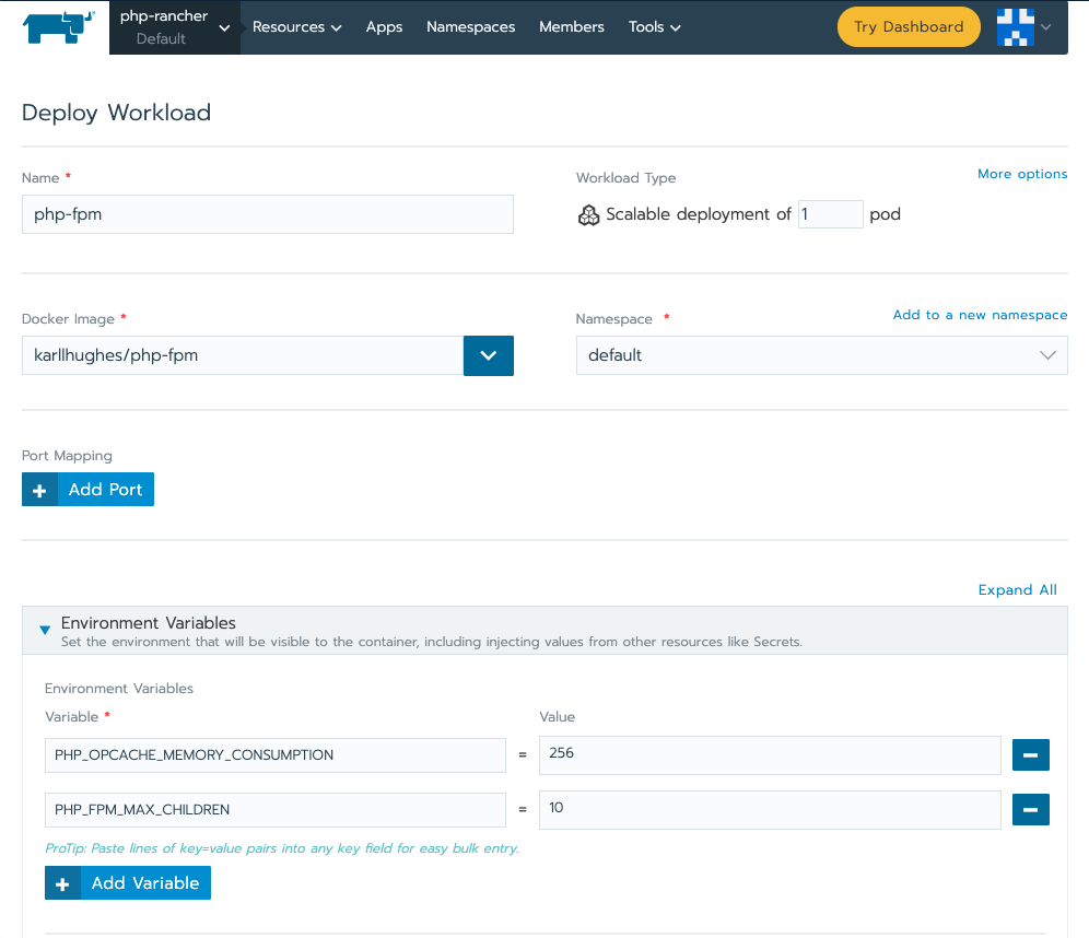 既然你的自定义PHP-FPM镜像在Docker Hub上已经可以获取,你可以将其作为工作负载的一部分部署在Kubernetes集群上。使用Rancher UI,创建一个新的deployment,将其命名为php-fpm,并使用<YOUR_USERNAME>/php-fpm作为Docker镜像。你可以修改以上Dockerfile中使用的任何PHP_OPCACHE _...和PHP_FPM _...环境变量。