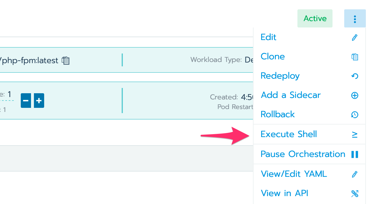 在设置Nginx工作负载以服务于PHP-FPM deployment之前,请检查你的PHP-FPM和OPcache设置是否已正确添加到容器中。在Rancher UI中,单击PHP deployment旁边的三个点,然后单击“ Execute Shell”: