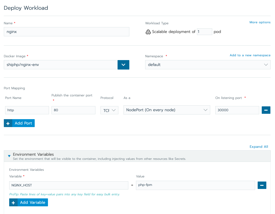 在Rancher UI中创建新的工作负载,该负载与PHP-FPM工作负载在相同的集群上。将其命名为nginx,使用Docker镜像shiphp / nginx-env,将容器上的端口80映射到集群上的开放端口,并添加环境变量NGINX_HOST = php-fpm: