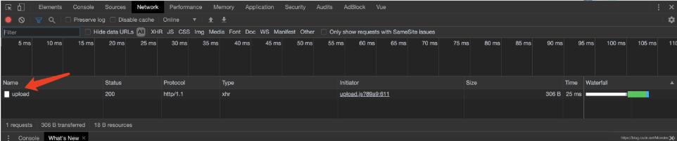 点击上传到服务器以后前台就会发出请求,我们就可以使用devtool看具体的请求头等等数据,具体位置在这里:
