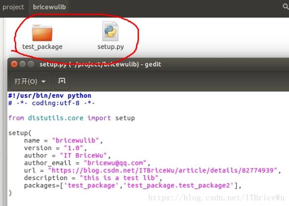 5.编写:setup.py,注意:setup.py与test_package包同在bricewulib根目录下,而setup.py中的内容如下图