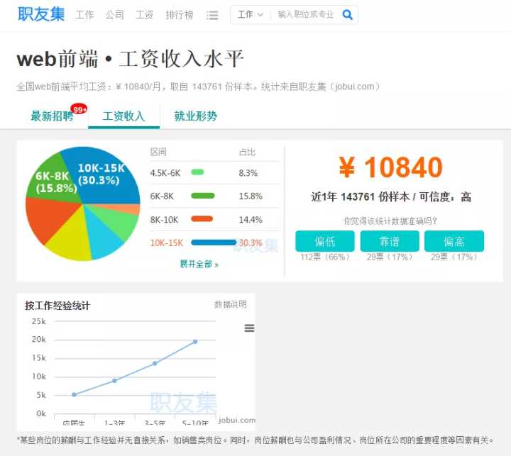 web前端开发工程师的薪资月平均收入为1万元,工作经验达到3年的web前端工程师甚至达到3万元。