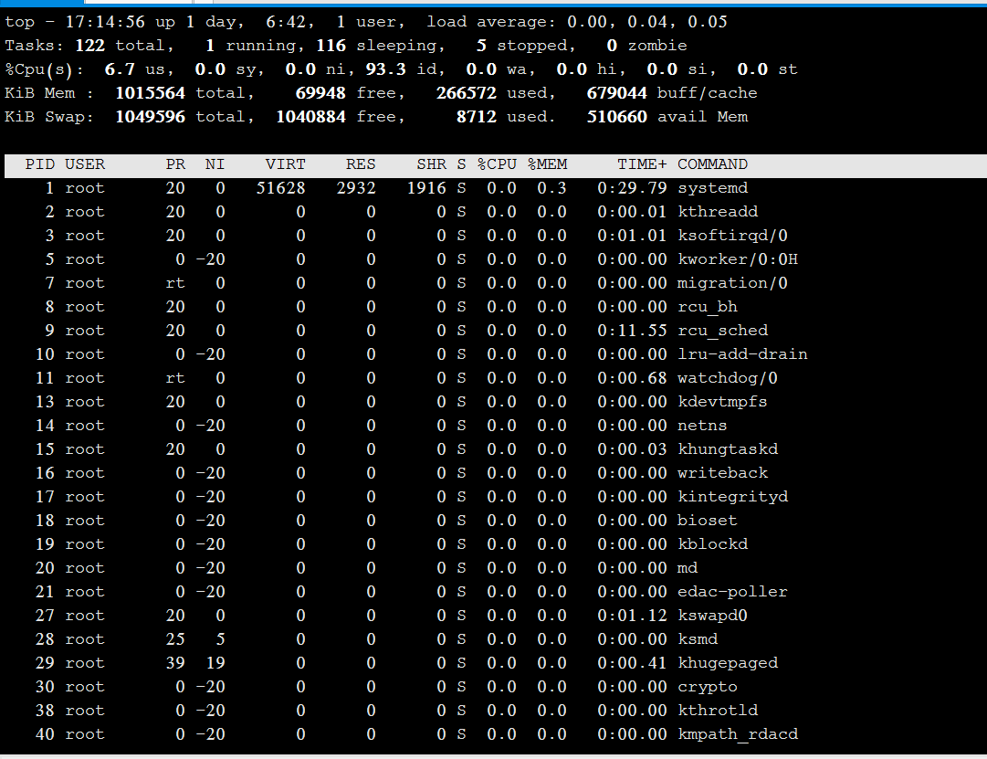 CPU信息:us,用户占用;sy,内核占用;ni,优先级调度占用;id,空闲CPU;wa,I/O等待占用;hi,硬件中断占用;si,软件中断占用;st,虚拟化占用。了解空闲的CPU百分比,主要看%id部分。
