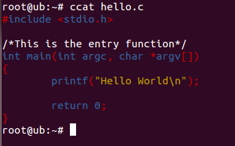 可以看出来代码没有任何颜色标记(大家应该对这个结果很熟悉)。现在,再使用 ccat 查看文本文件 hello.c ,并查看其如何显示输出。