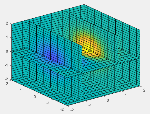 slice(v, sx, sy, sz):输入参数 v 为三维矩阵(阶数为 m x n x p),x、y、z 轴默认状态下分别为 1:m、1:n、1:p,数据 v 用于指定第四维的大小,在切片图上显示为不同的颜色,输入参数 sx、sy、sz 分别用于指定切片图在 x、y、z 轴所切的位置。