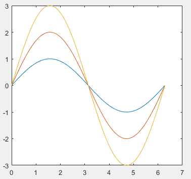 plot(x,sin(x),x,2*sin(x),x,3*sin(x))