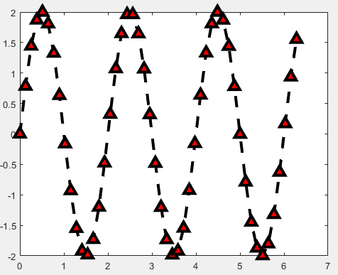 例: 设置正弦曲线的线宽为 3,设置上三角形进行数据点的标记,并设置标记 点边缘为黑色,设置标记点填充颜色为红色,设置标记点的尺寸为 10,则 MATLAB 代码 如下: