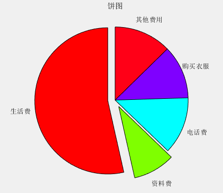 pie(x,explode,{'生活费','资料费','电话费','购买衣服','其他费用'})