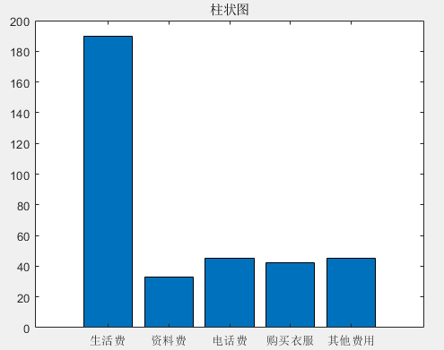 例:有一位研究生,在一年中平均每月的费用为生活费 190 元,资料费 33 元, 电话费 45 元,购买衣服 42 元,其他费用 45 元。请以柱状图表示出他每月的消费比例。 MATLAB 代码如下: