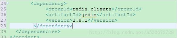4 .之后在pom.xml中添加jedis依赖,这样Maven就会自动把指定jar包添加到项目中了,十分方便