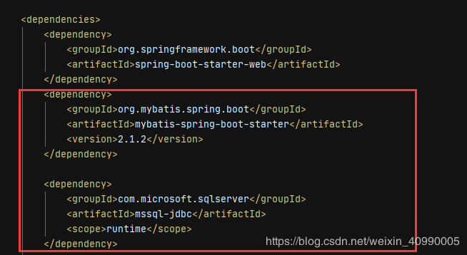 (1)重新创建项目,选中入mybatis和sqlserver,结果就是pom.xml文件多了这两个依赖。