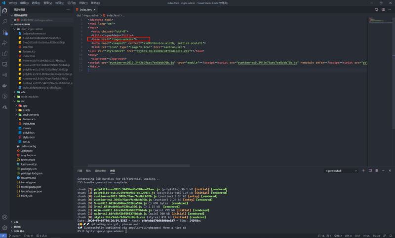 可以看到,在打包生成的 index.html 文件中,插件已经帮我们修改了 base 标签的 href 地址。以后当我们需要更新网站时,再使用上面的命令即可发布到 github page 上