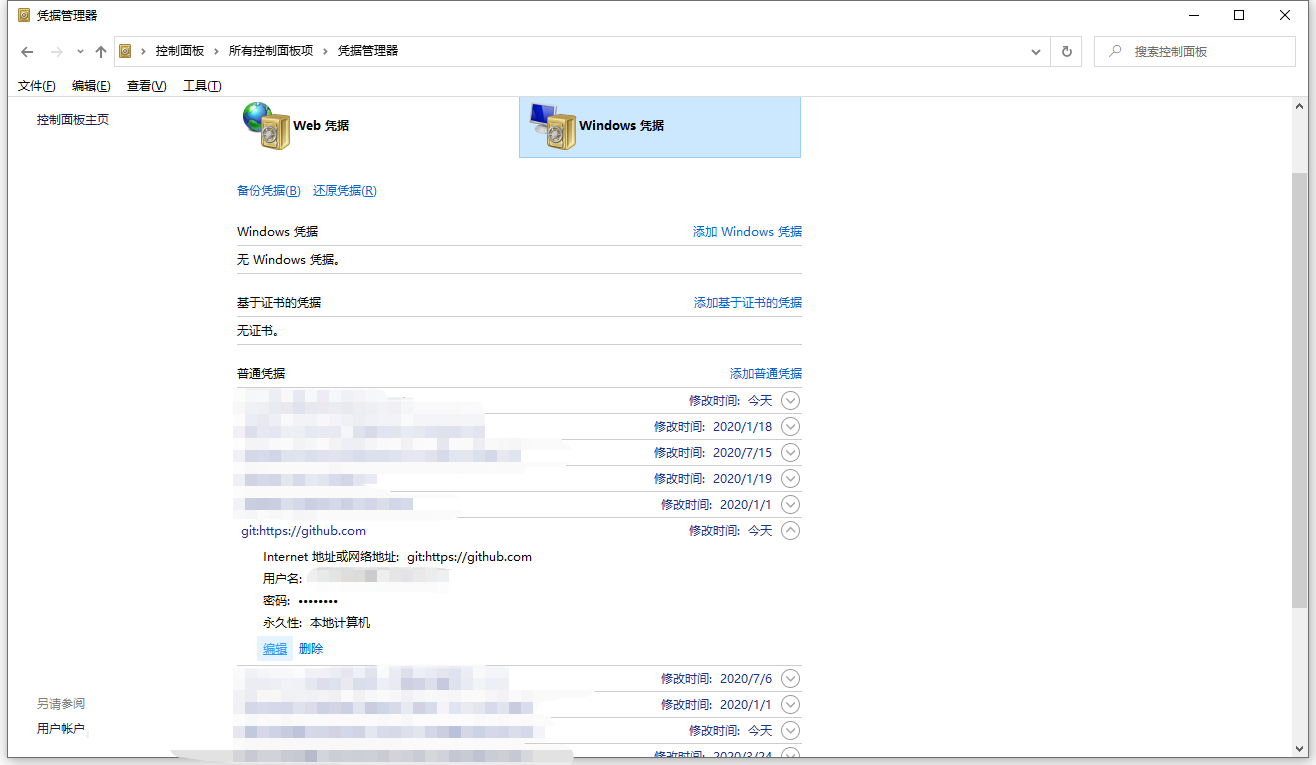 复制生成的 token 信息,打开电脑的凭据管理器,在 Windows 凭据标签内,找到 github 相关的凭据,此时你可以将已经存在的凭据密码更新成刚才复制的 token 信息,或者直接将已经存在的 github 凭据删除,这样再推送到 github 时会要求你进行登录,重新登录时将密码录入为你复制的 token 信息即可