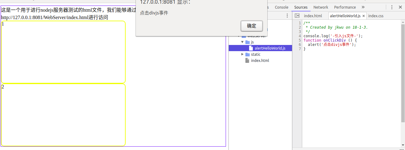 在上面效果中,当我点击2号div的时候,将会调用我在js文件夹中的方法去执行弹窗,详细代码请到github下载:https://github.com/suwu150/node-http-server