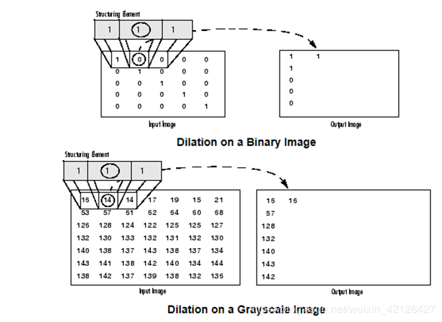 二值图像与灰度图像上的膨胀操作: