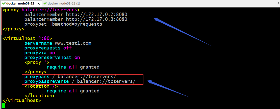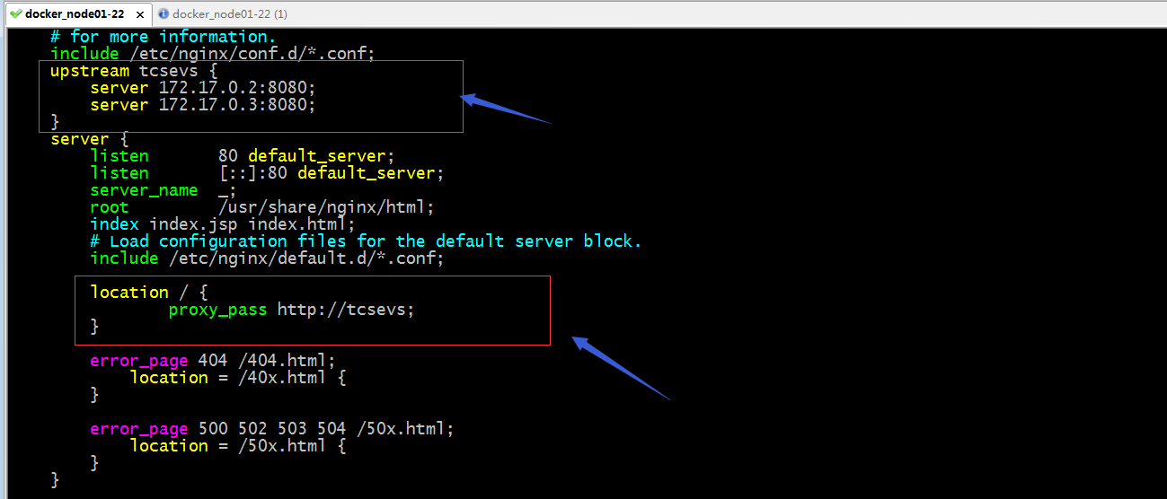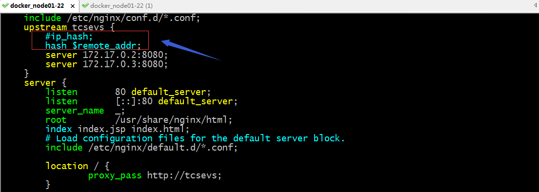 提示:以上配置就是把两台tomcat容器归并为tcsevs组,然后反代/的访问到这个组上即可。这样配置默认是轮询的;