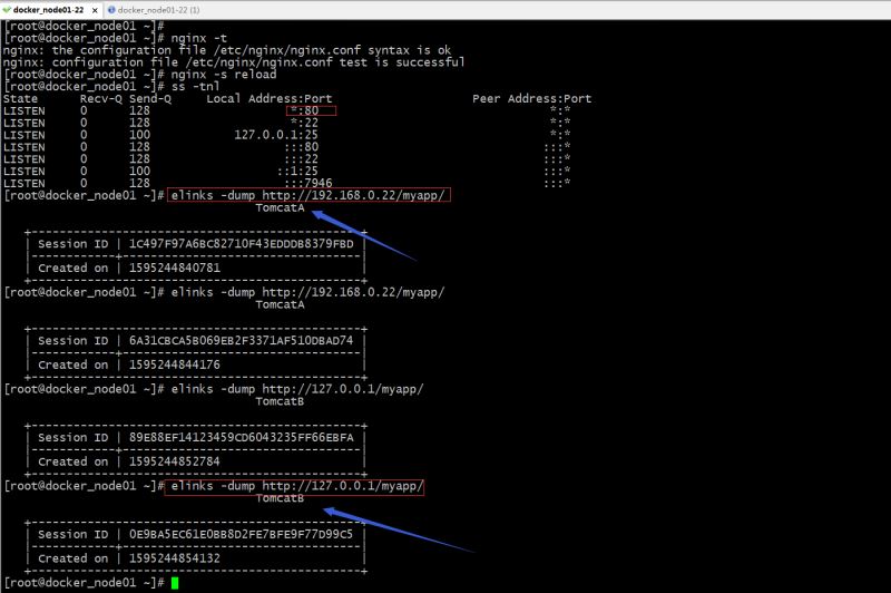 测试:重启niginx ,访问宿主机的80端口看看是否都把请求调度到同一后端server上?