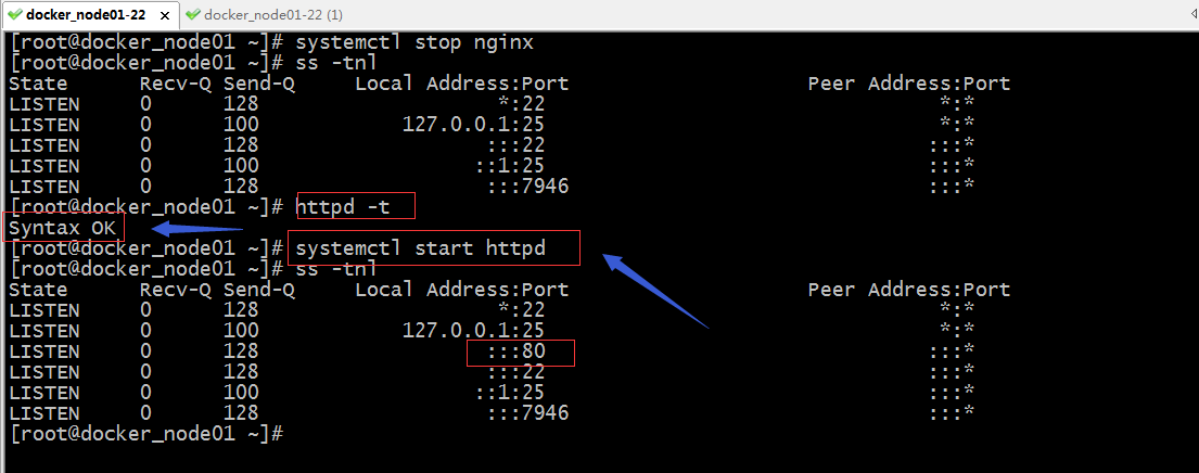 停掉nginx,检查httpd 的配置文件语法,如果没有问题就启动httpd