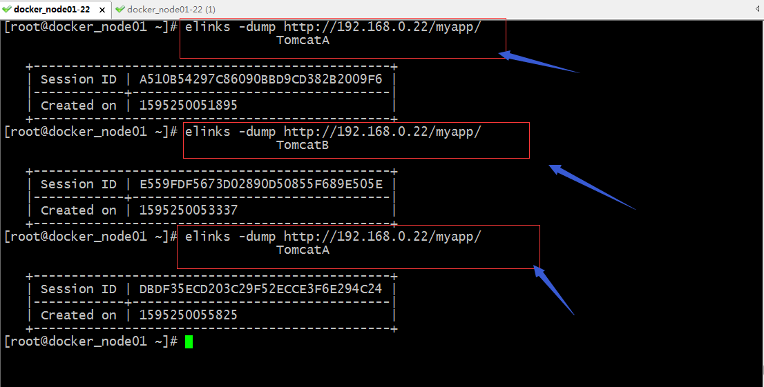 提示:可以看到访问宿主机的80端口是能够正常访问到后端tomcat服务器上的,并且也看出了默认轮询调度的效果;但是这里存在一个问题,同一用户访问宿主机的80端口,给我们响应的结果session id都不同,这意味着nginx并没有追踪到用户的状态信息,原因是因为http请求本来就是无状态的,为了让服务记录用户的状态信息,在nginx上我们可以基于源ip做调度,什么意思呢,就是同一源ip地址,nginx都把该请求调度到同一台后端server上,使得同一用户访问的状态信息始终调度到同一后端server上;