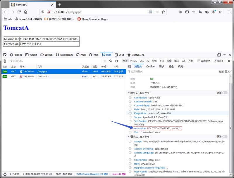 提示:可以看到客户端在请求首部cookie中,把之前set-cookie中的值都携带过去了;此时httpd收到客户端请求就可以根据设置的stickysession 指定的KEY来判断该把对应请求发送到那个后端server上进行响应了;这样一来,只要客户端的cookie不变,那么它每次访问服务端都会以cookie首部的值去告诉服务端该调度到那台后端server上;