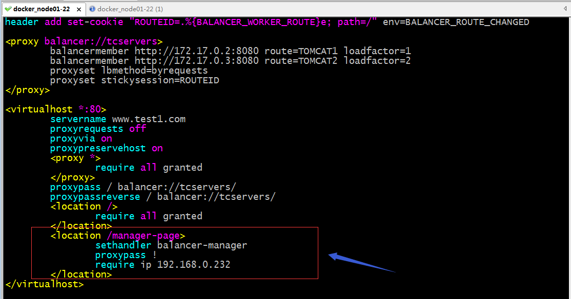 提示:以上配置表示启动httpd管理页面,并绑定到/manager-page这个uri上,对于/manager-page这个uri不做任何代理,并且该rui只能允许ip地址为192.168.0.232的主机访问,其他主机都没有权限,包括服务器本身;