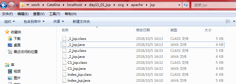 当我们通过浏览器(http://localhost:8080/day11_01_jsp(项目名称)/C1.jsp)访问C1.jsp时,服务器首先将C1.jsp翻译成一个C1_jsp.class,在Tomcat服务器的work\Catalina\localhost\项目名\org\apache\jsp目录下可以看到C1_jsp.class的源代码。(1.jsp翻译成_1_jsp.class)