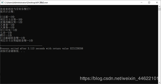 1.本次作业为KFC点餐系统,刚开始的想法是用Java做,但是在看了许多资料结合自己的情况,最终采用C++来写程序,C++确实较Java熟悉了很多。