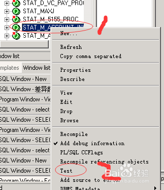 找到想要调试的存过,左键单击选中该存过(图中位置1),然后右键单击该存过,从弹出菜单中选择“Test”项(图中位置2)。