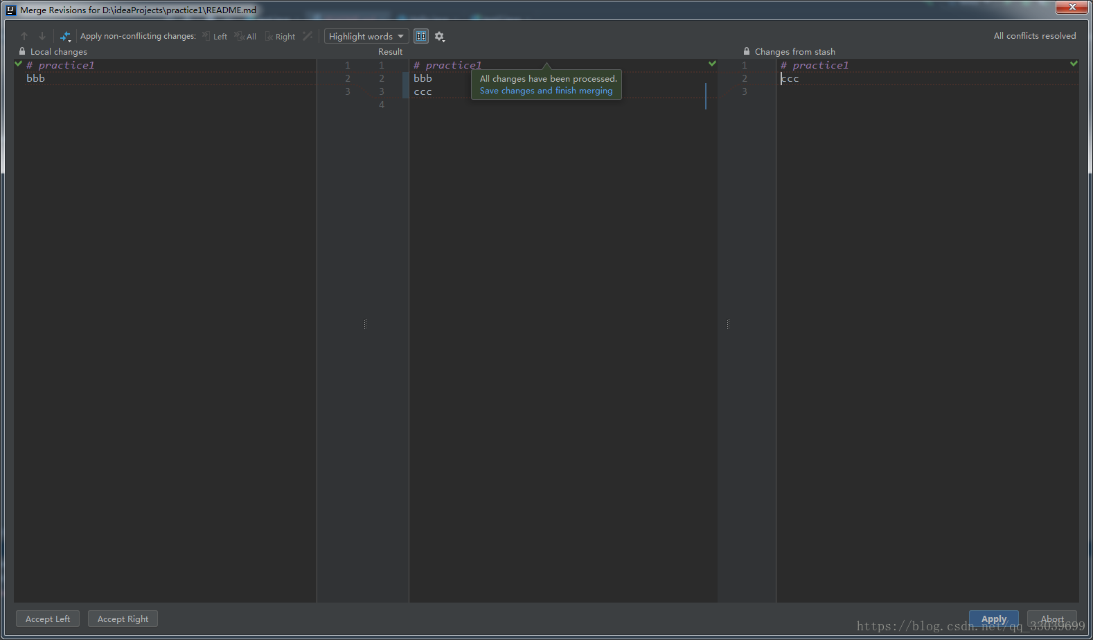 Accept Right其实就相当于是之前的 Accept Yours 和 Accept Theirs 右下角的Apply是确认合并,Abort是取消合并。