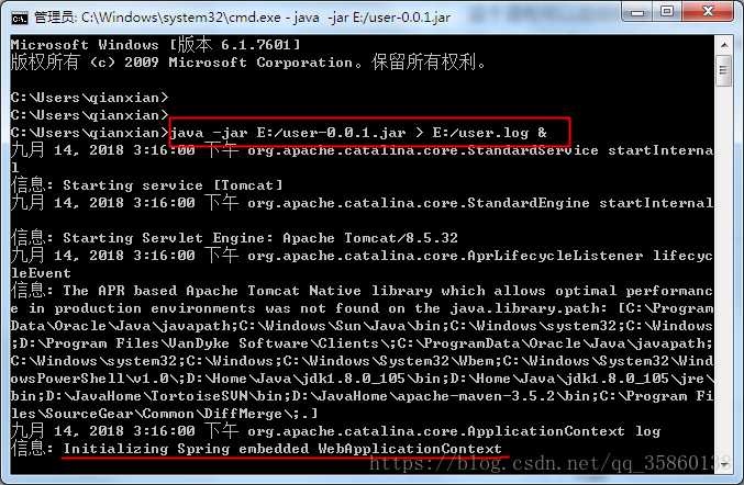 【6】在cmd命令窗口下执行运行jar包的命令:java -jar E:/user-0.0.1.jar