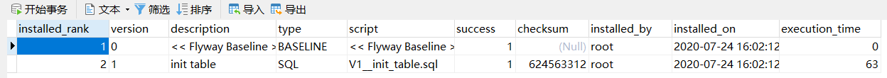 此时flyway会默认添加一张记录数据库版本信息的表,每次启动时会根据version值判断是否需要执行sql。