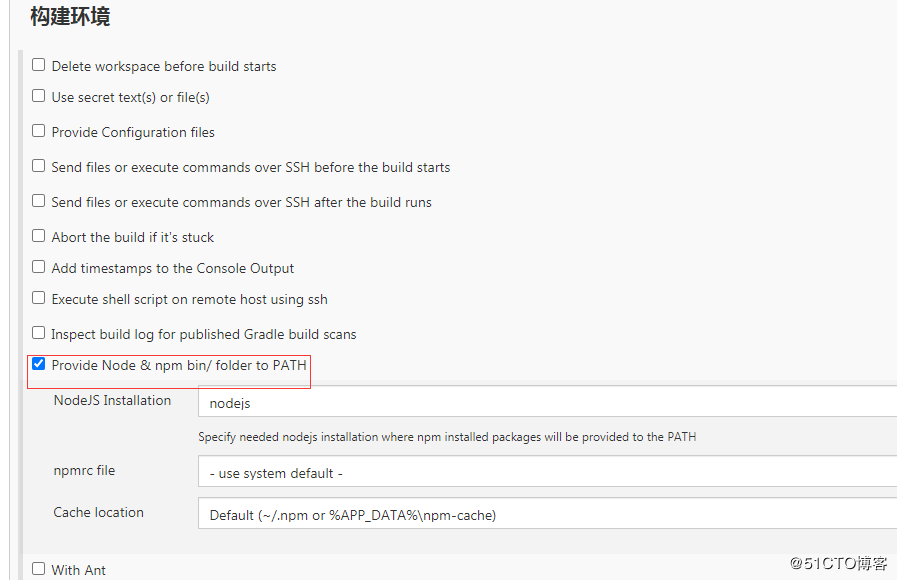 5、在构建环境这一步选择Provide Node & npm bin/ folder to PATH