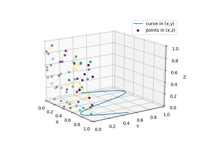 ax.scatter(x, y, zs=0, zdir='y', c=labels, label='points in (x,z)')