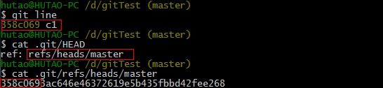 我们看到c1的提交hash值和HEAD对应分支master的当前hash值是一样的。也就是说,HEAD指向的是当前分支名master,而master又对应了当前的最新的一次提交ID.