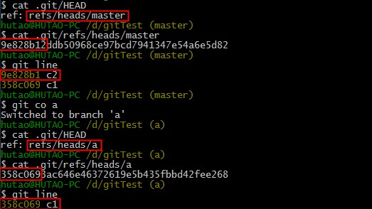 从上图分析,在master分支上的时候,HEAD指向的是master,对应的是c2的commit ID。而切换到a分支的时候,HEAD也相应的指向了a,同时a对应的是a分支上的最新commit ID。因此,我们可以得出结论,在切换分支的时候,HEAD也会相应的指向对应的分支引用。