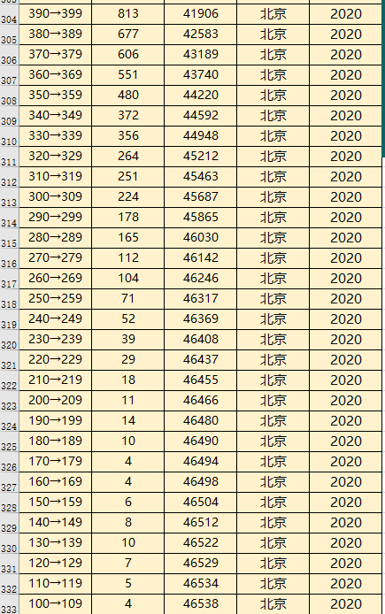 北京的人数更少,在400分以下每10分段给出人数,我们为了便于方便 默认每个分数平均人数, 比如 390-399分段的人有813人,我们认为每个分段都有81.3人,暂时这么处理。