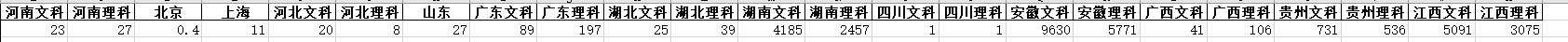 res_name = {'河南文科',	 '河南理科',	 '北京',	 '上海', '河北文科', '河北理科', '山东', '广东文科' '广东理科' '湖北文科', '湖北理科', '湖南文科', '湖南理科', '四川文科', '四川理科', '安徽文科', '安徽理科', '广西文科', '广西理科', '贵州文科', '贵州理科', '江西文科', '江西理科'};
