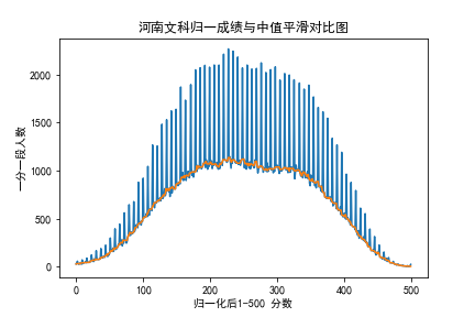 以河南文科为例, 我们直接绘制归一化之后的成绩并进行中值滤波之后对比,