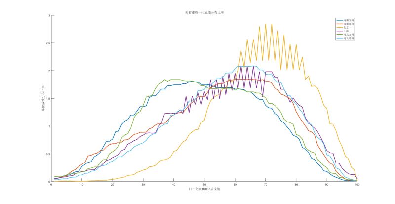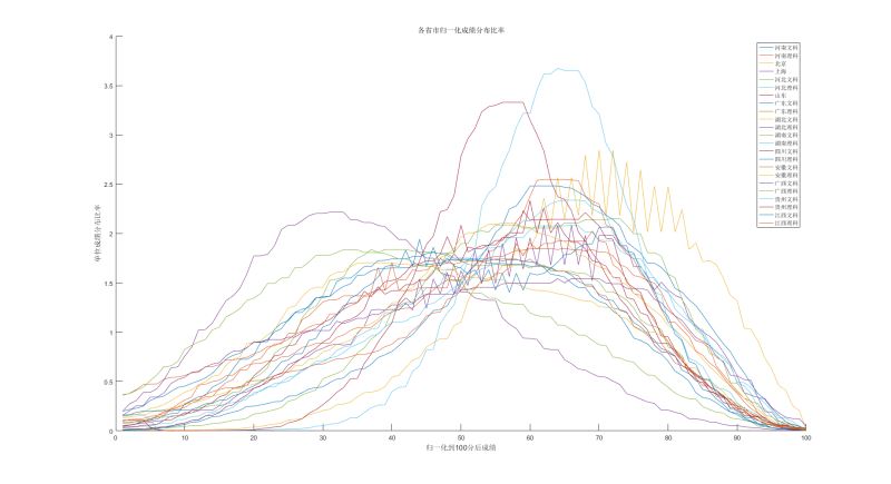 # 整理数据,将各省市的成绩归一到100分之后的分布比率