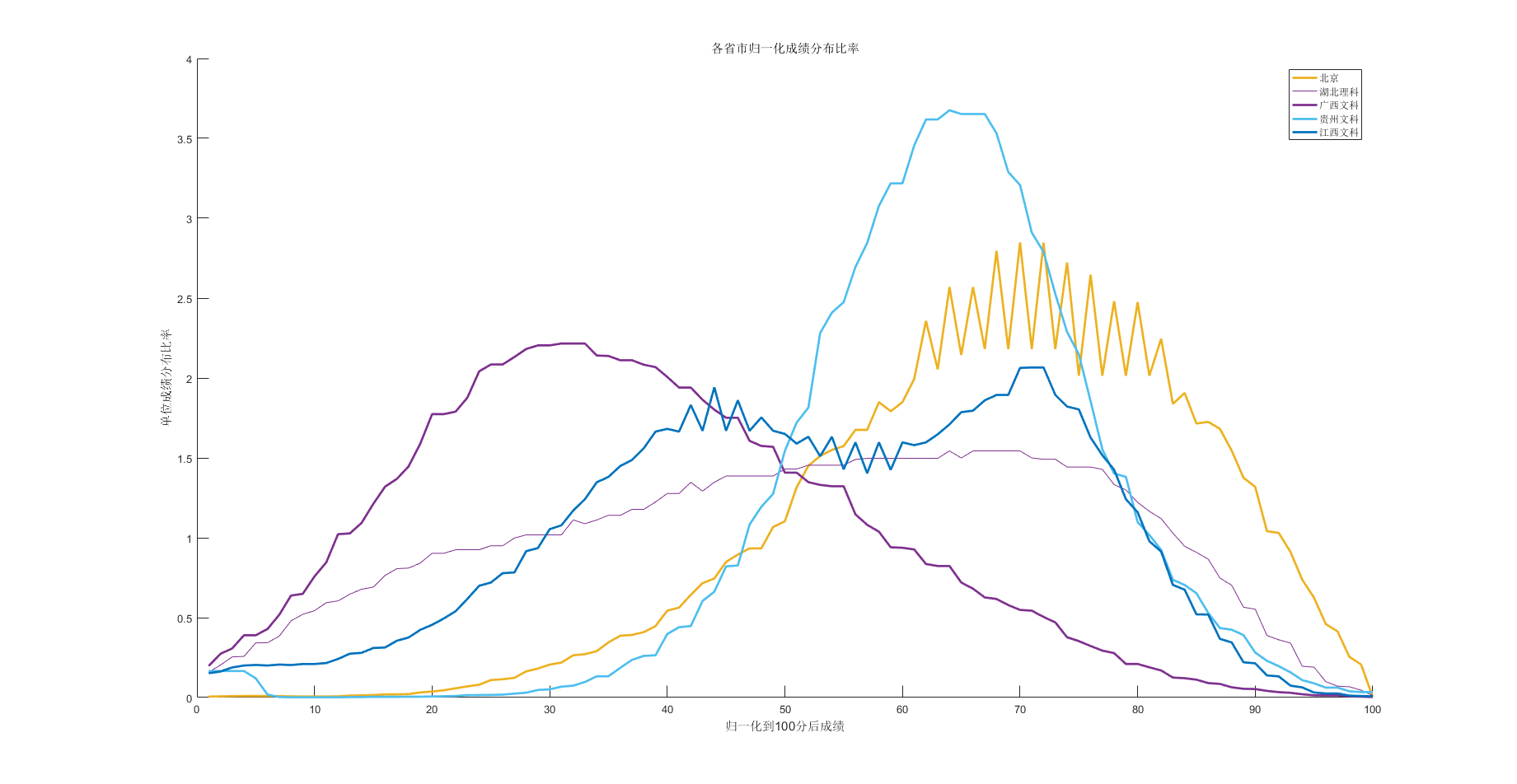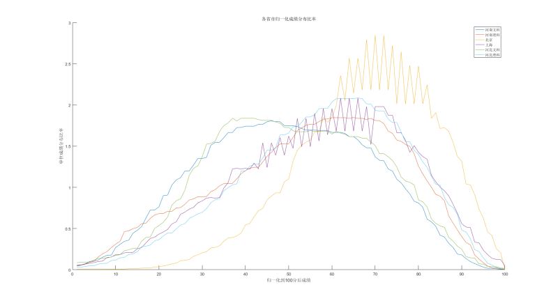 对于每个省的成绩将其调整到 [0,100], 这里使用的是 四舍五入, 导致实际在计算过程中的数据会重叠,比如相邻的两个成绩一个舍去,一个入上,在统一分数,导致数据噪声较大, 这是使用 一维的中值滤波平滑一下数据就好了,