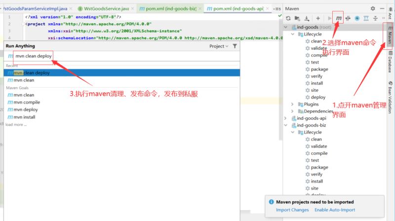 4、在idea中点击右侧工具栏中的maven,再选择maven弹出框中的m标识,选择对应的项目,执行mvn clean deploy,将项目打包发布到私服。