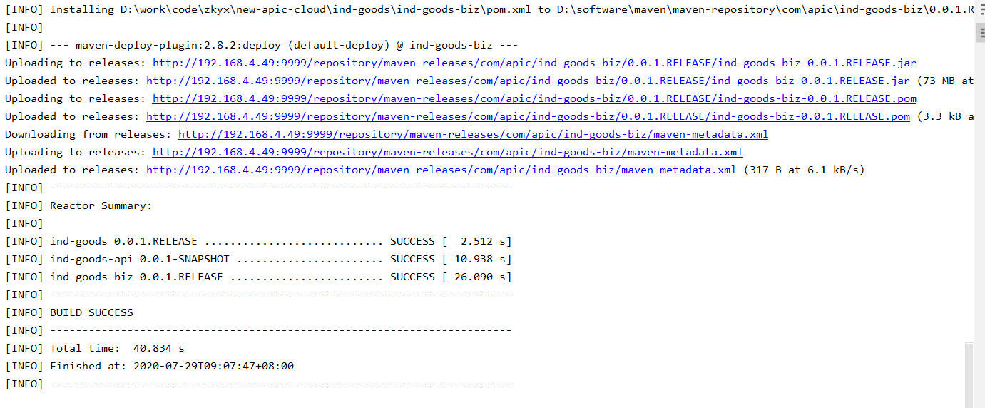 模块项目中如果存在父子项目,且父子项目的jar包都需要上传到私服的话,直接在父项目pom文件中添加这段配置,如果只需要将子项目jar包上传私服,则在子项目的build标签同级添加这段配置。