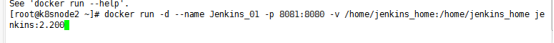 docker run -d --name Jenkins_01 -p 8081:8080 -v \ /home/jenkins_home:/home/jenkins_home jenkins:2.200