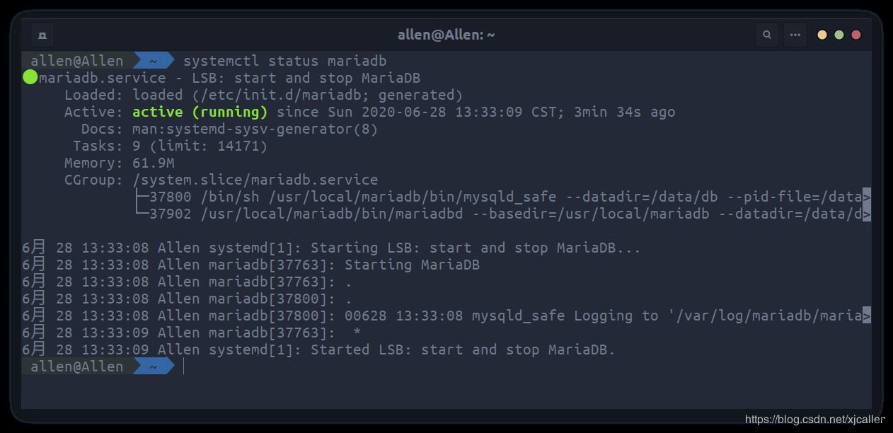 sudo rm -rf /etc/mysql sudo apt remove -y mysql-common sudo apt autoremove -y sudo apt install -y cmake libncurses5-dev libgnutls28-dev sudo groupadd -r mysql && sudo useradd -r -g mysql -s /sbin/nologin -d /usr/local/mariadb mysql sudo mkdir -p /data/db /var/log/mariadb cd /home/allen/下载/mariadb-10.5.4/ cmake . -DCMAKE_INSTALL_PREFIX=/usr/local/mariadb -DMYSQL_DATADIR=/data/db -DSYSCONFDIR=/etc -DWITHOUT_TOKUDB=1 -DMYSQL_UNIX_ADDR=/tmp/mysql.sock -DDEFAULT_CHARSET=utf8mb4 -DDEFAULT_COLLATION=utf8mb4_general_ci make -j 4 && sudo make install sudo /usr/local/mariadb/scripts/mysql_install_db --user=mysql --datadir=/data/db sudo vim /etc/my.cnf [mysqld] datadir = /data/db socket = /tmp/mysql.sock # 建议禁用符号链接,防止各类安全风险 symbolic-links = 0 collation-server = utf8mb4_general_ci init-connect = 'SET NAMES utf8mb4' character-set-server = utf8mb4 [mysql] default-character-set = utf8mb4 [client] port = 3306 socket = /tmp/mysql.sock default-character-set = utf8mb4 [mysqld_safe] log-error = /var/log/mariadb/mariadb.log pid-file = /var/run/mariadb/mariadb.pid sudo cp /usr/local/mariadb/support-files/mysql.server /etc/init.d/mariadb sudo vim /etc/profile.d/mariadb.sh export PATH=$PATH:/usr/local/mariadb/bin/ sudo chmod 0777 /etc/profile.d/mariadb.sh source /etc/profile.d/mariadb.sh sudo /etc/init.d/mariadb start #Starting mariadb (via systemctl): mariadb.service. sudo /usr/local/mariadb/bin/mysql_secure_installation #NOTE: RUNNING ALL PARTS OF THIS SCRIPT IS RECOMMENDED FOR ALL MariaDB # SERVERS IN PRODUCTION USE! PLEASE READ EACH STEP CAREFULLY! #In order to log into MariaDB to secure it, we'll need the current #password for the root user. If you've just installed MariaDB, and #haven't set the root password yet, you should just press enter here. #Enter current password for root (enter for none): #OK, successfully used password, moving on... #Setting the root password or using the unix_socket ensures that nobody #can log into the MariaDB root user without the proper authorisation. #You already have your root account protected, so you can safely answer 'n'. #Switch to unix_socket authentication [Y/n] y #Enabled successfully! #Reloading privilege tables.. # ... Success! #You already have your root account protected, so you can safely answer 'n'. #Change the root password? [Y/n] y #New password: #Re-enter new password: #Password updated successfully! #Reloading privilege tables.. # ... Success! #By default, a MariaDB installation has an anonymous user, allowing anyone #to log into MariaDB without having to have a user account created for #them. This is intended only for testing, and to make the installation #go a bit smoother. You should remove them before moving into a #production environment. #Remove anonymous users? [Y/n] y # ... Success! #Normally, root should only be allowed to connect from 'localhost'. This #ensures that someone cannot guess at the root password from the network. #Disallow root login remotely? [Y/n] n # ... skipping. #By default, MariaDB comes with a database named 'test' that anyone can #access. This is also intended only for testing, and should be removed #before moving into a production environment. #Remove test database and access to it? [Y/n] y # - Dropping test database... # ... Success! # - Removing privileges on test database... # ... Success! #Reloading the privilege tables will ensure that all changes made so far #will take effect immediately. #Reload privilege tables now? [Y/n] y # ... Success! #Cleaning up... #All done! If you've completed all of the above steps, your MariaDB #installation should now be secure. #Thanks for using MariaDB! sudo systemctl enable mariadb sudo chown mysql:mysql -R /usr/local/mariadb /data/db /var/log/mariadb reboot